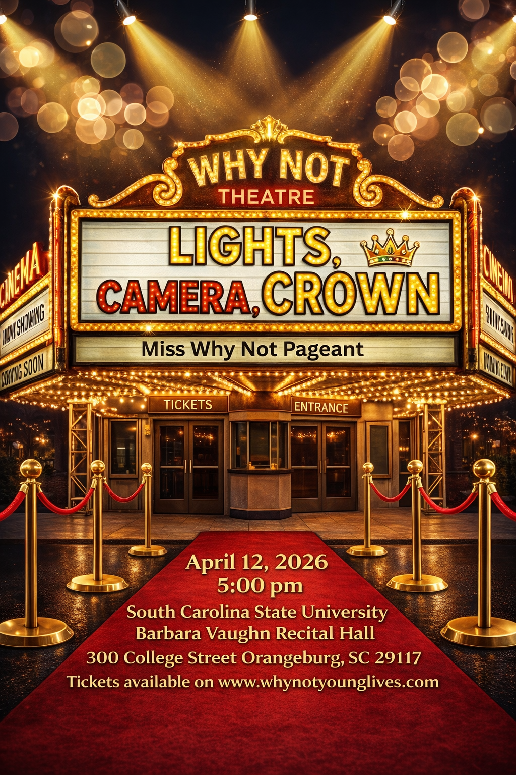 Your Ticket is a Vote for Their Future! Join us for an evening of elegance and empowerment at the "Lights, Camera, Crown" Miss Why Not Pageant. By purchasing a ticket, you are directly investing in the success of our scholars.