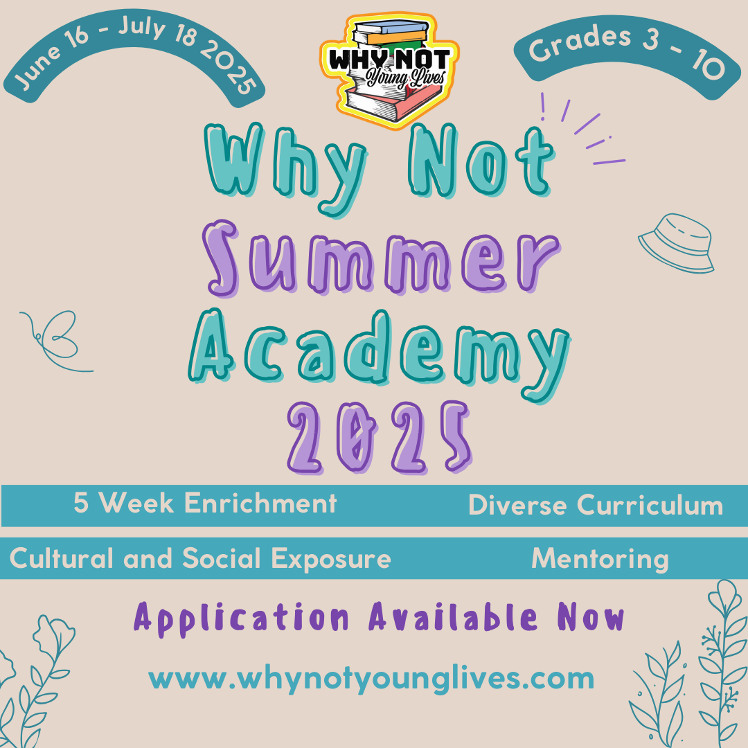 The Why Not Young Lives Summer Academy is a five-week literacy, math, and cultural enrichment program designed to support children in grades 3–9 in communities where quality academic enrichment is either limited, too expensive, or non-existent. Our goal is to enhance children’s motivation to read and learn through engaging activities, including STEM, while fostering a love for education. Our students engage with a research-based, multicultural curriculum that empowers them to believe in their potential to make a difference both in their lives and in their communities.